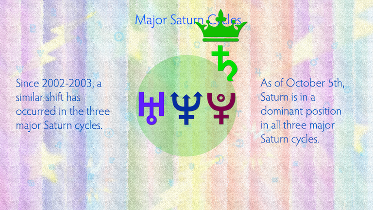 On October 5th, with the transformational process about to shift into high gear, Saturn, will seize the reins from Uranus. With the help of the North Node, Saturn will solidify its influence over the global transformational process. And not a moment too soon.