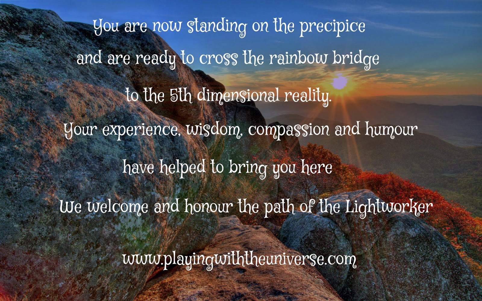 It is time to take your power. To stand tall and stand proud for all that you have done, for all that you have been through and we applaud your courage, perseverance and tenacity that it has taken to get you this far in life. You are now standing on the precipice and are ready to cross the rainbow bridge to the 5th dimensional reality. Your experience, wisdom, knowledge and humour have helped to bring you here and as you step upon the bridge you are bringing all of those who walk behind you with you. You are ready and it is now time.