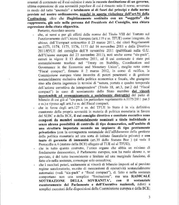 La denuncia continua: "Contenuto essenziale della sovranità di un popolo è dato dalla propria sovranità in materia di politica monetaria, economica e fiscale: è con essa, ed attraverso i suoi strumenti, che un popolo determina le sue sorti.